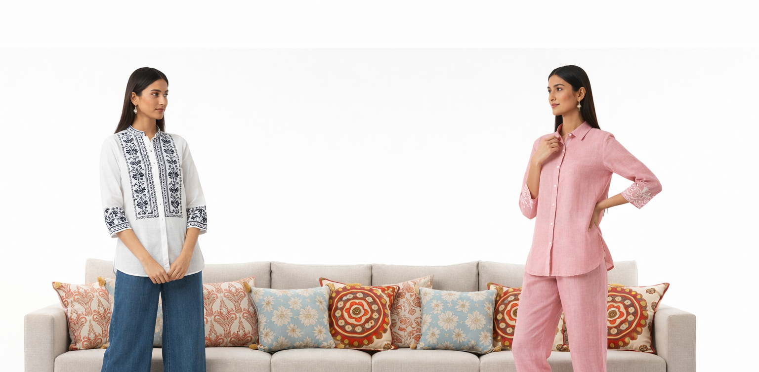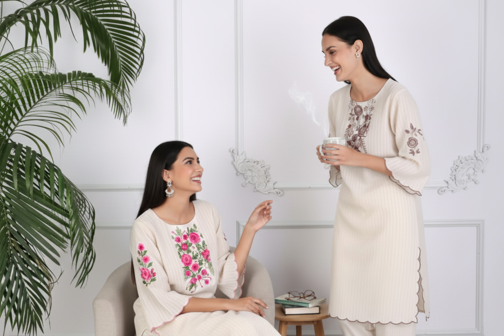 Blue Floral Print Cotton Co-ord Set with Embroidery