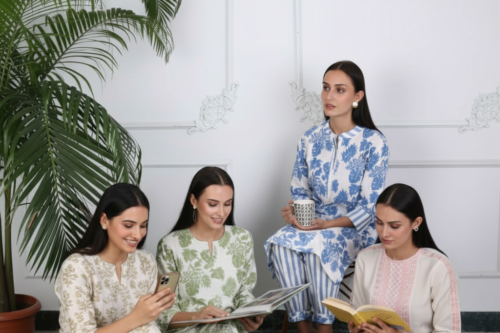 Blue Floral Print with Stripes Cotton Co-ord Set